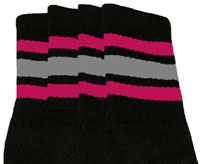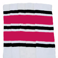Knee high white tube socks with Black/Bubblegum Pink stripes