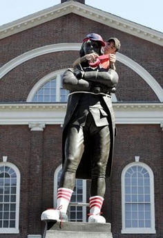 Samuel Adams statue Pimpin' skatersocks style in front of Faneuil Hall in Boston, Monday, Sept. 19, 2005.